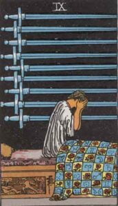 當你抽到寶劍9,代表你正在想東想西,思想非常混亂。短期頂多悶悶不樂,但長期有可能會引致其他病症,失眠,焦躁,抑鬱等等。我特別推薦抽到寶劍9的人,可以經常練習冥想冥想可以減壓減憂,更可以改善睡眠。重點是專注在身體感覺、思想和情緒,類似以第三者角度更清楚地觀察它們,而不做過多批判。
